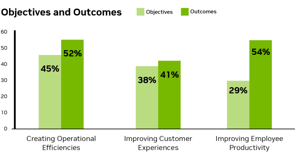 Across the industry, the business impact of AI has been tangible and significant. When asked how AI has improved their business, 54% cited improved employee productivity; 52% said AI has helped to create operational efficiencies; and 41% reported improved customer service.