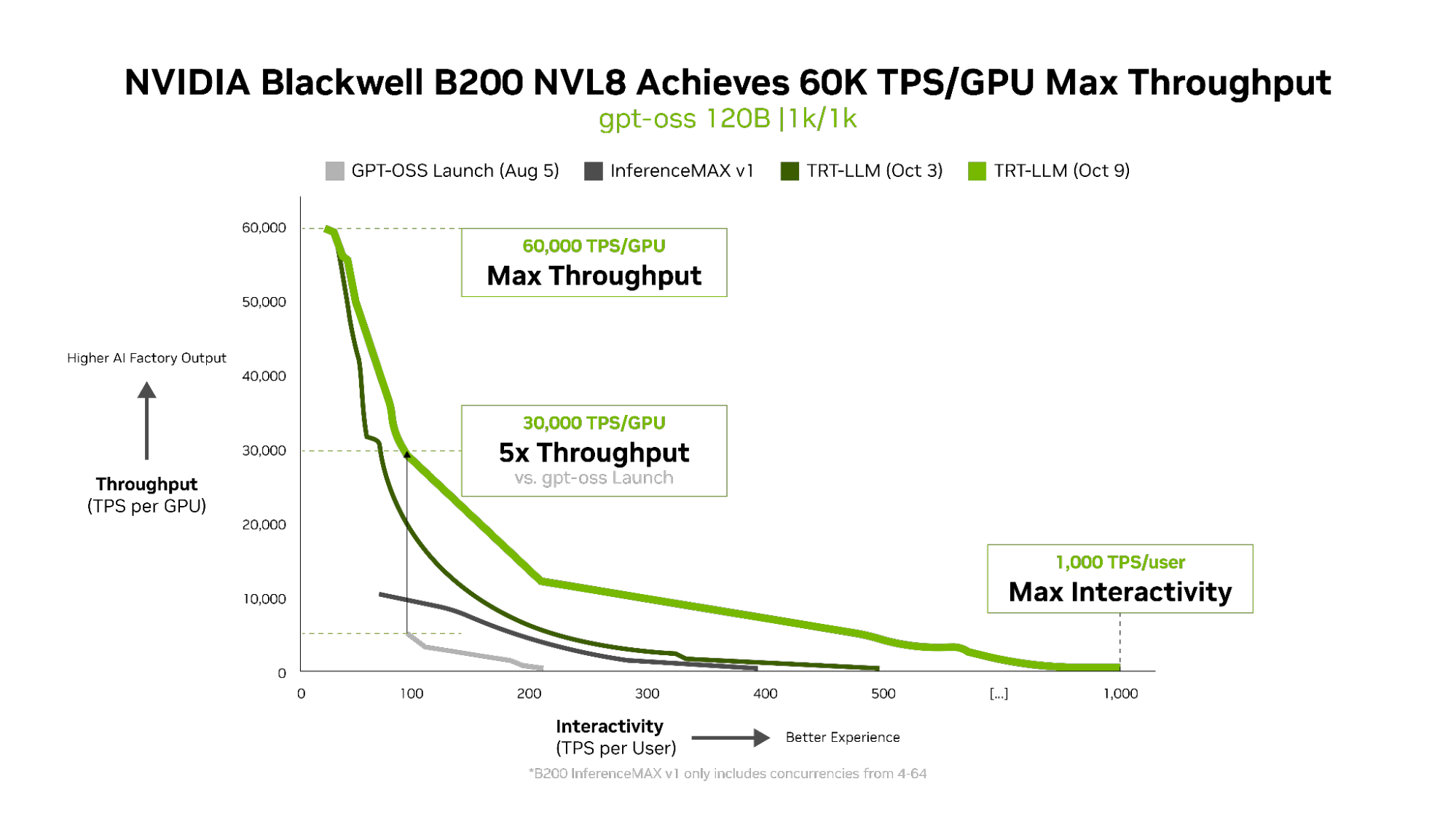 NVIDIA continuously improves performance through hardware and software codesign optimizations. Initial gpt-oss-120b performance on an NVIDIA DGX Blackwell B200 system with the NVIDIA TensorRT LLM library was market-leading, but NVIDIA’s teams and the community have significantly optimized TensorRT LLM for open-source large language models.