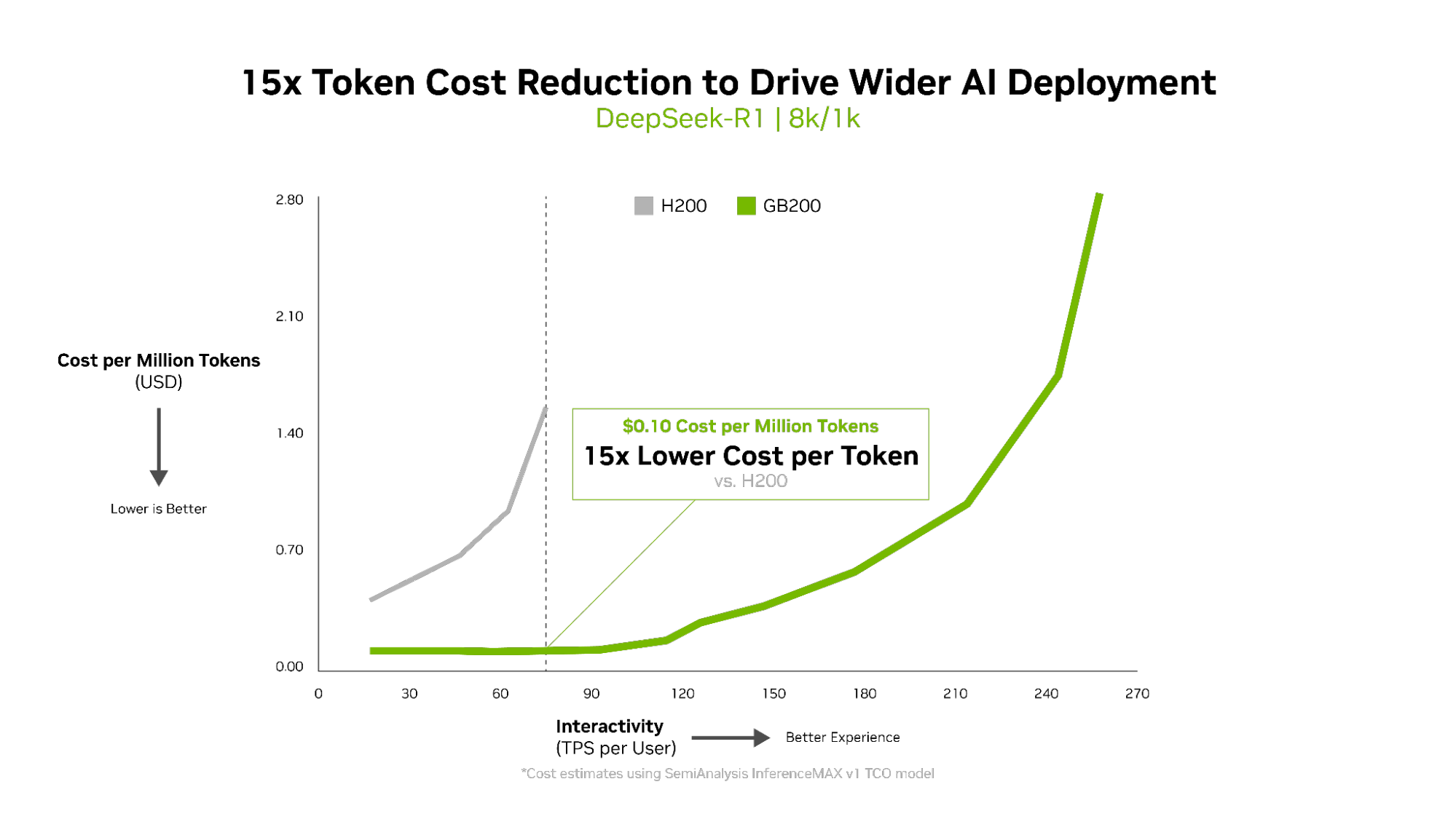 Metrics like tokens per watt, cost per million tokens and TPS/user matter as much as throughput. In fact, for power-limited AI factories, Blackwell delivers 10x throughput per megawatt compared with the previous generation, which translates into higher token revenue.