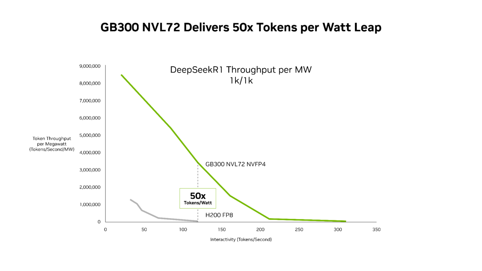 Building on these software advances, GB300 NVL72 — which features the Blackwell Ultra GPU — pushes the throughput-per-megawatt frontier to 50x compared with the Hopper platform.