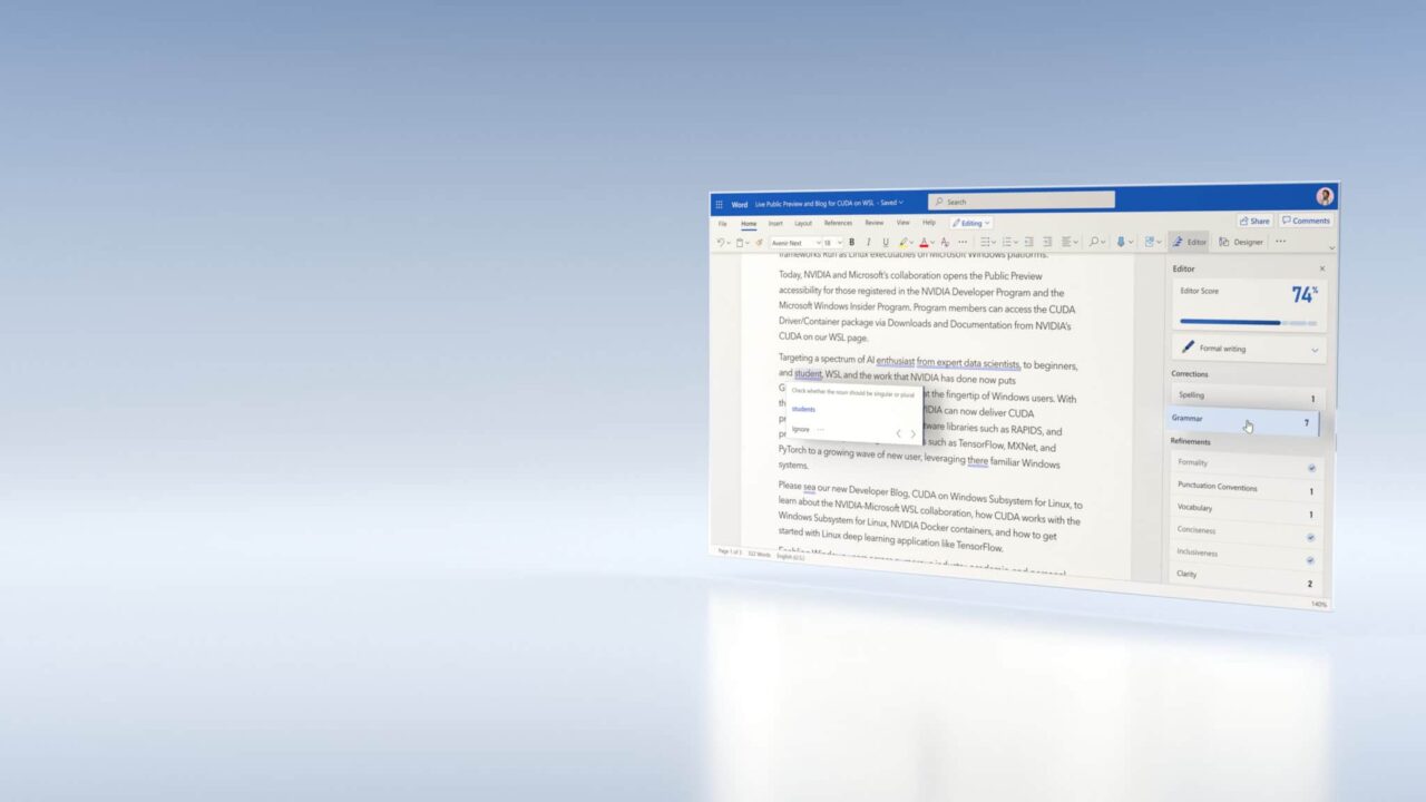 Like any good editor, it’s quick and knowledgeable. That’s because Microsoft Editor’s grammar refinements in Microsoft Word for the web can now tap into NVIDIA Triton Inference Server, ONNX Runtime and Microsoft Azure Machine Learning, which is part of Azure AI, to deliver this smart experience.
