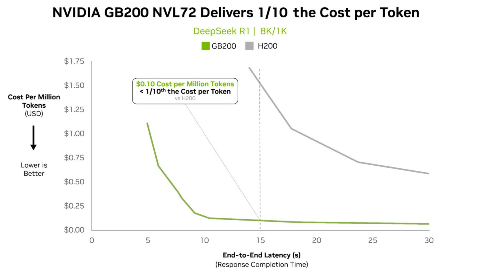 Simply put, because GB200 NVL72 processes ten times as many tokens using the same time and power, the cost required to generate each individual token drops. GB200 NVL72’s order-of-magnitude efficiency gains far outweigh its incremental increase in costs, resulting in significantly better token economics.